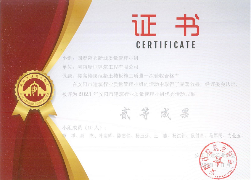 近日,公司國泰瓴秀新城項目申報的《提高樓層混凝土樓板施工質量一次驗收合格率》和《提高內墻抹灰質量一次驗收合格率》兩項QC成果榮獲2023年度安陽市建筑行業質量管理小組優秀活動成果。
