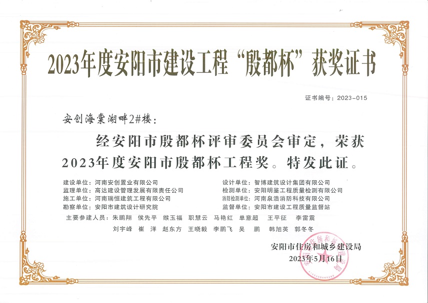 近日,由河南瑞恒建筑工程有限公司承建的安創海棠湖畔1#、2#樓,從眾多參選項目中脫穎而出,榮獲2023年度安陽市建設工程“殷都杯”榮譽證書。項目在建設期間嚴格遵循建筑規范、技術標準和建設程序,嚴抓安全生產工作,搶抓工程節點,確保項目建設按序時推進。同時嚴格秉承精益求精的建設理念,注重細節,保障工程質量,確保高標準完成建設任務。